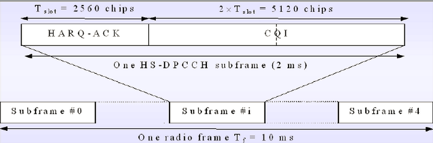 滿足上述條件之后,就可以啟動(dòng)HSDPA了,UE接入小區(qū)后,在HS-DPCCH上上報(bào)CQI之后,NodeB也選擇了調(diào)制和編碼方式,但是隨著CQI的不斷變化,NodeB也會(huì)選擇不同的調(diào)制和編碼方式。與此同時(shí),NodeB還要決定用多少資源來(lái)給UE使用。這些信息都是通過(guò)HS-DPCCH來(lái)反饋和傳送。HS-DPCCH數(shù)據(jù)速率為15Kbps,SF=256,采用2ms的短幀,承載HSDPA的兩種上行物理層信令:ACK/NACK和CQI。CQI:信道質(zhì)量指示,ACK/NACK:指示數(shù)據(jù)是否正確,ACK表示沒(méi)錯(cuò),NACK表示出錯(cuò),需要重傳,只有數(shù)據(jù)傳輸時(shí)才發(fā)送。