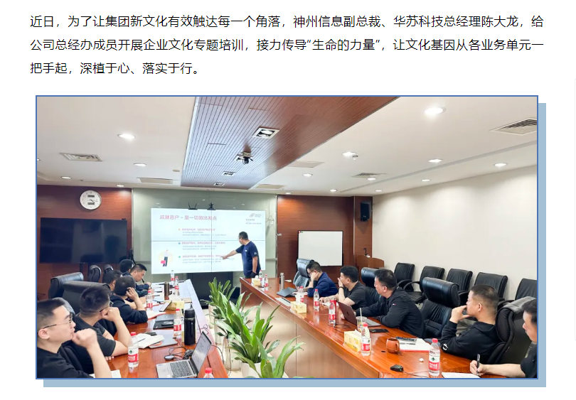 為了讓集團(tuán)新文化有效觸達(dá)每一個(gè)角落,神州信息副總裁、華蘇科技 總經(jīng)理陳大龍,給公司總經(jīng)辦成員開展企業(yè)文化專題培訓(xùn),