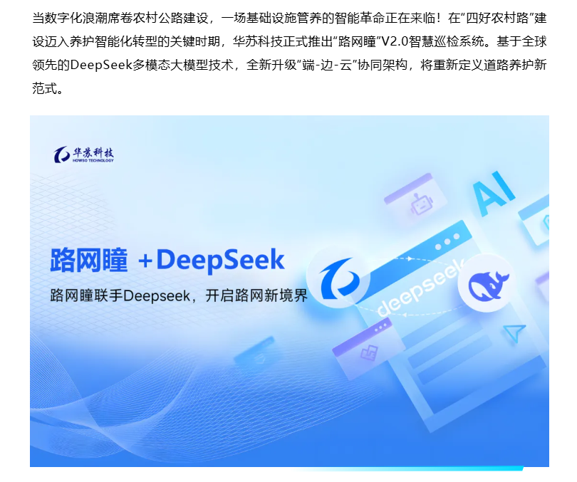 DeepSeek+道路養(yǎng)護(hù)=?華蘇科技“路網(wǎng)瞳”V2.0帶來(lái)全新答案