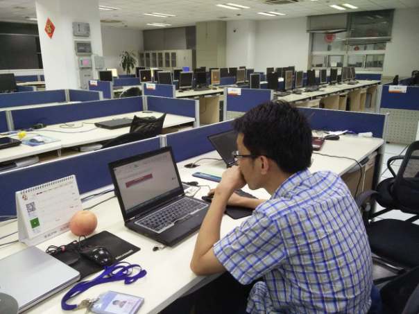 下午五點半左右,外場校園保障工作終于告一段落,他們和“東南大學”留影紀念后便匆匆趕回公司,開會探討保障工作中發(fā)現(xiàn)的問題并研究對策,以及明天的工作安排。趕回的途中,楊軍建說:“今天是陰天,時不時下點小雨,還是比較涼爽的。”樂呵呵的他,如此滿足。